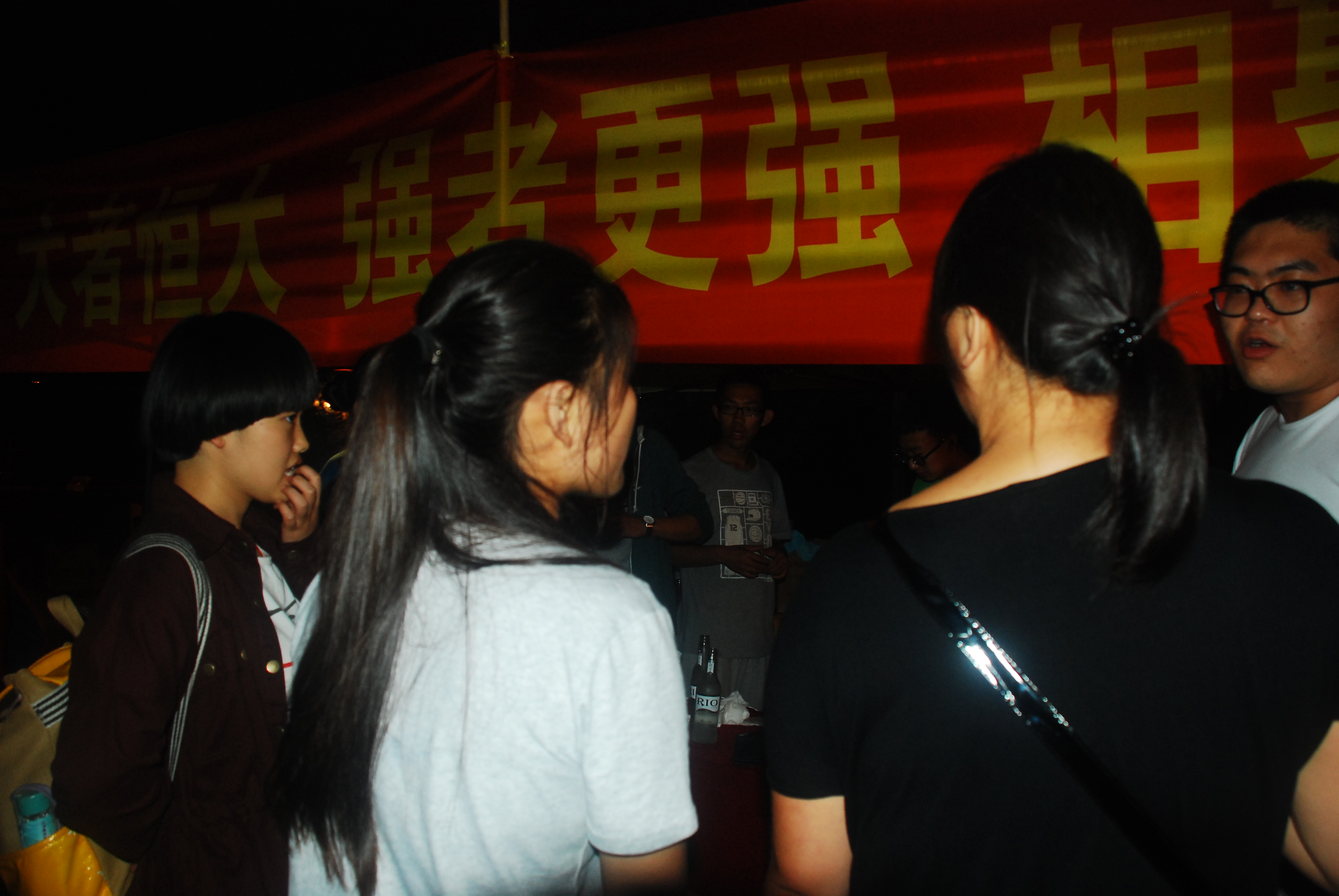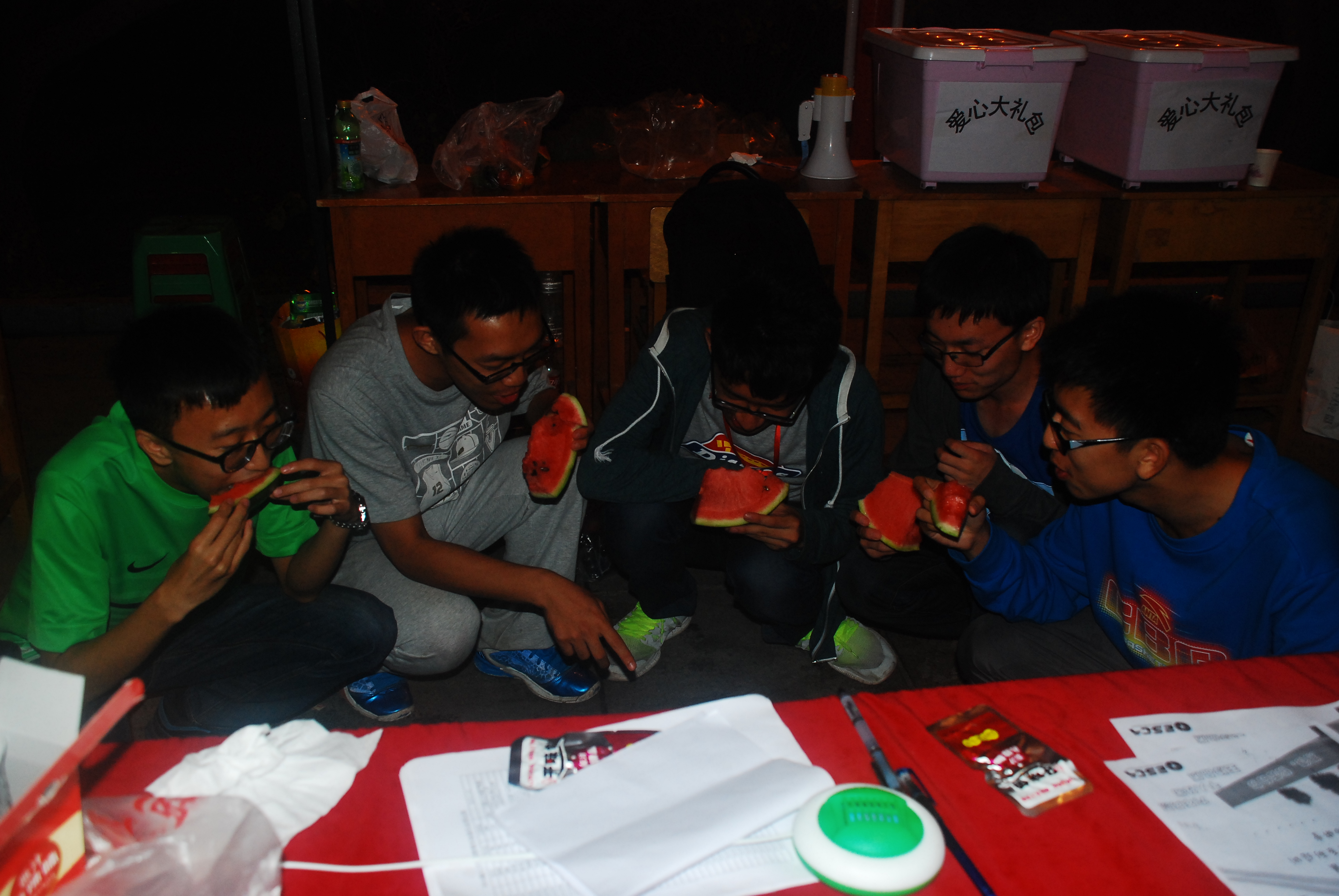 晚上,校园各处都寂静无声,五月花广场虽然没有了白天的热闹,却并不同于校内其他角落。伴随着点点灯光,一眼就看见了amjs澳金沙门欢迎您的专设帐篷,有一种温暖的家的感觉。而值夜的同学苦中作乐,一边吃着西瓜一边谈天说地,开怀大笑,这种深厚的友谊将夜间的寂静与疲劳一扫而空。