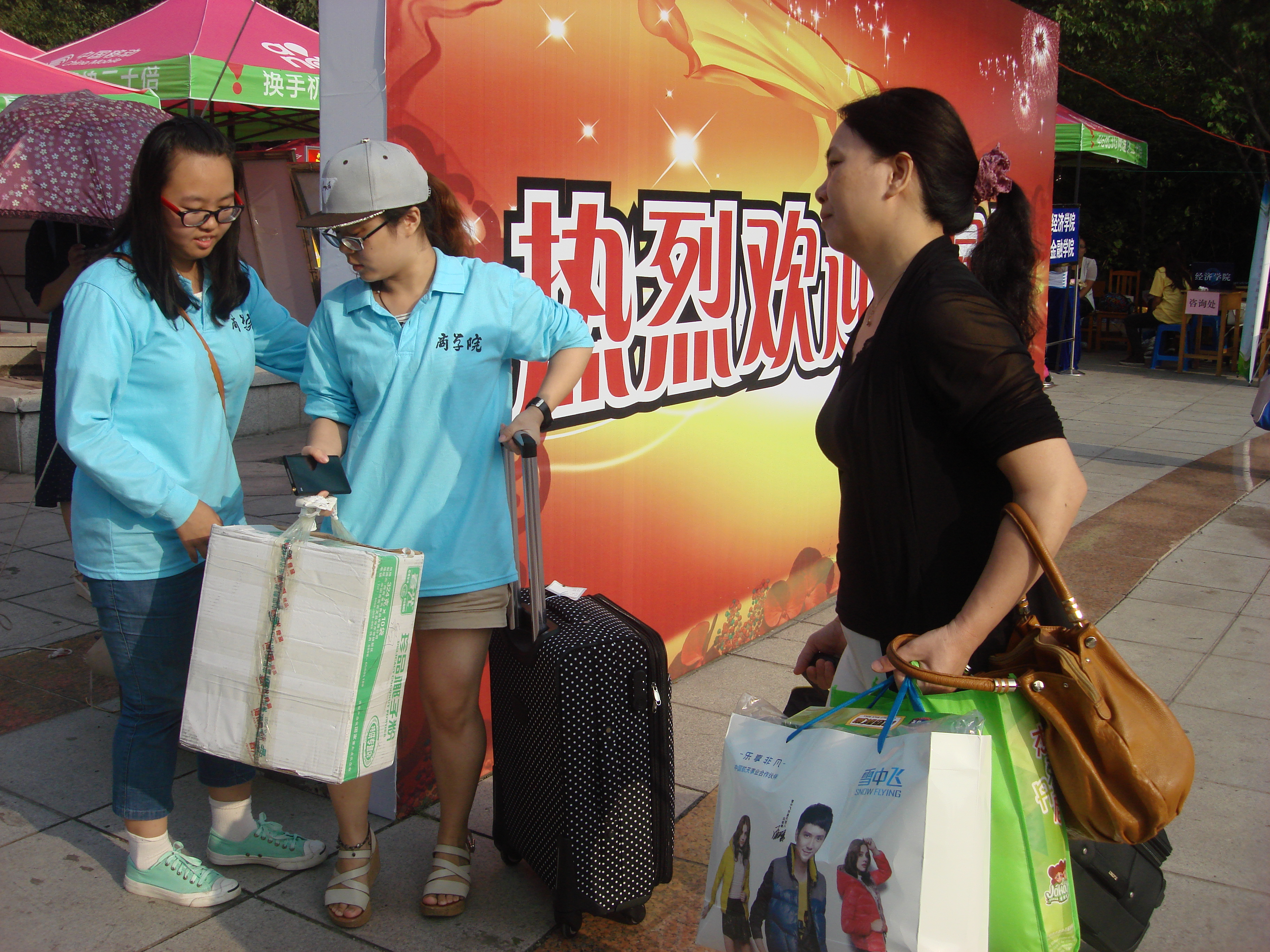 8月31日,虽然已经不是迎新的高峰期,但是迎新的工作人员依然坚守在自己的工作岗位上,积极帮助有需要的新生,对行李繁重的新生和家长提供便利。