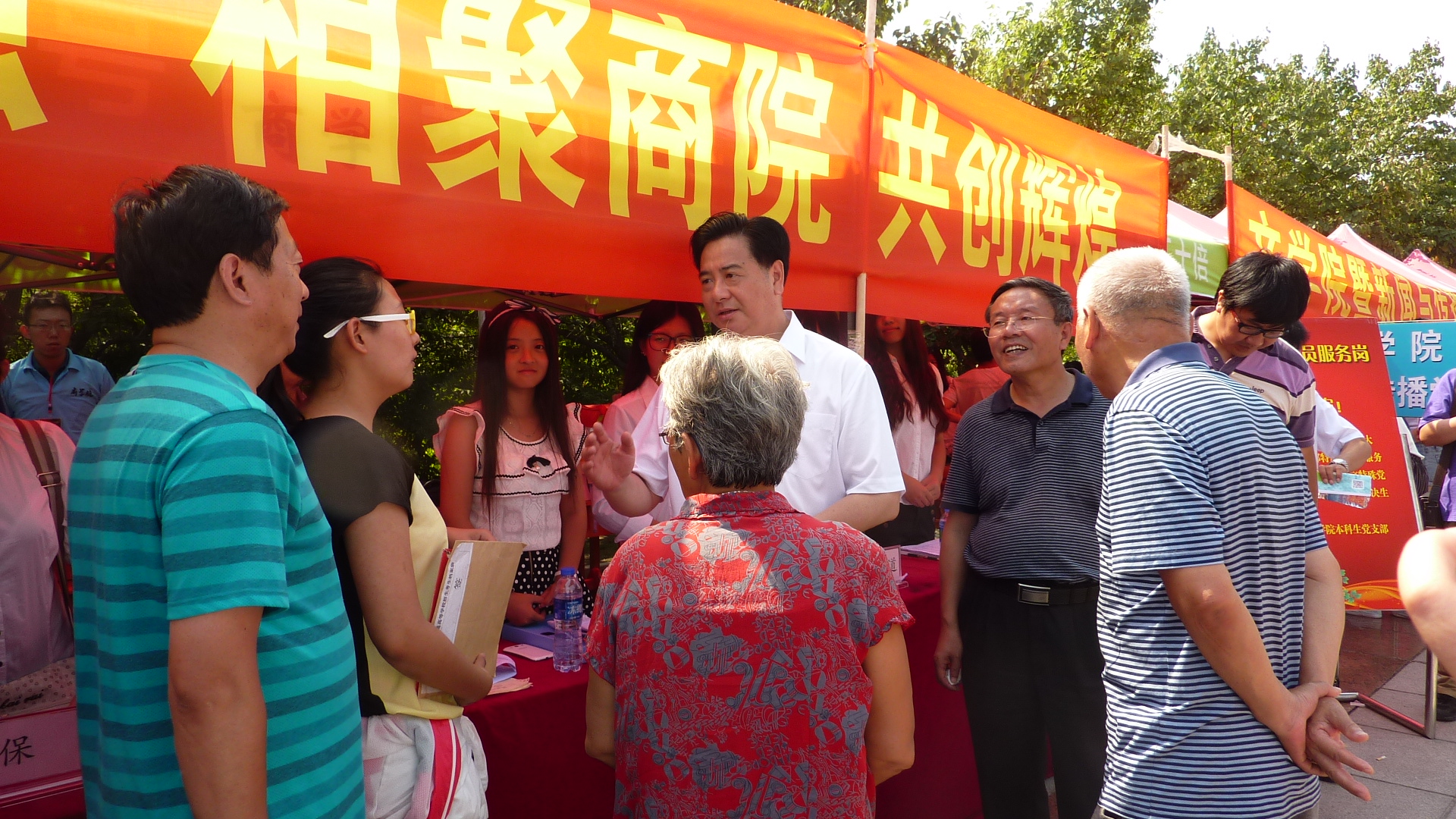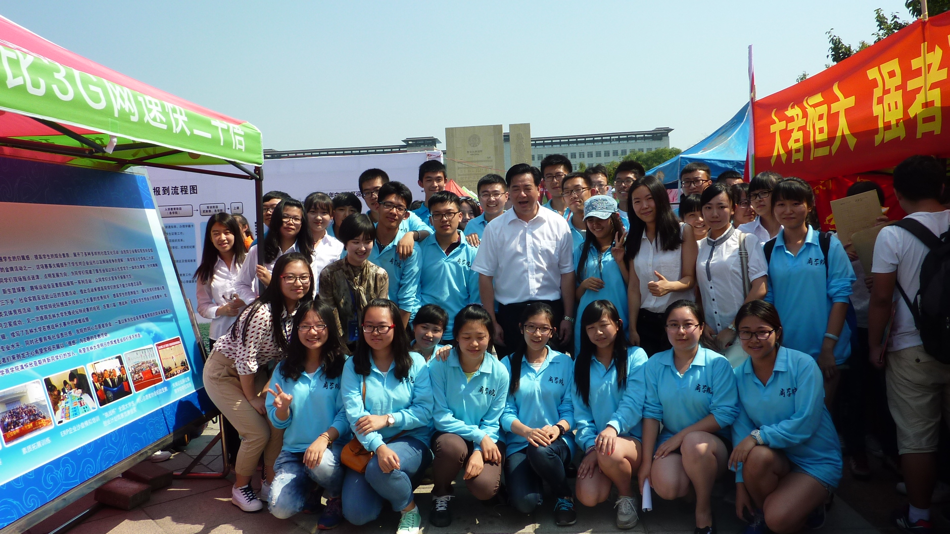 最后,离开amjs澳金沙门欢迎您迎新帐篷前,李校长与老师、同学们亲密合影。作为最后一个视察的迎新点,李校长上午的工作基本结束。当看到还在工作的同学们,他关切地问大家有没有午饭吃,并大声说,没吃午饭的可以跟我走,在得到同学们会有午饭提供的回复后才离开。
