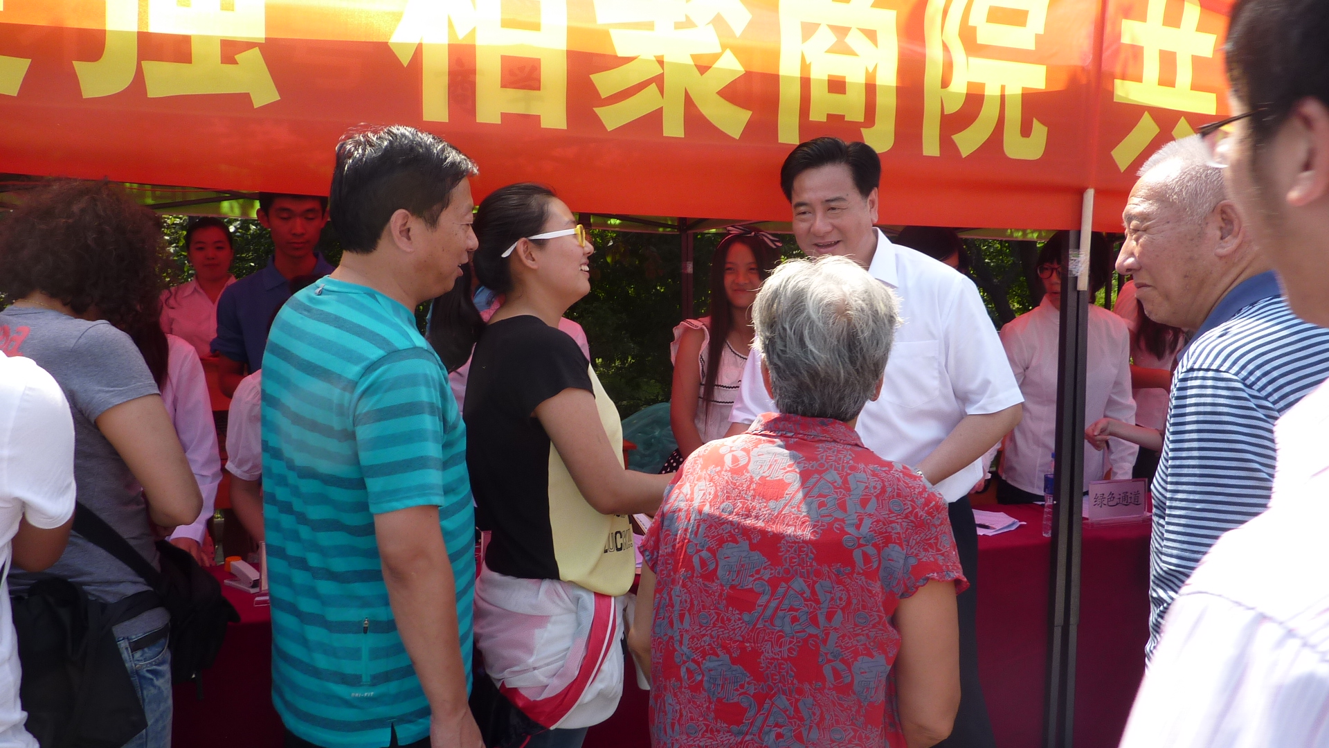 在此期间,迎新工作仍然紧张有序的进行着。李校长与一位刚刚做完登记的内蒙女孩拉起了家常。看到来送女孩的家人,李校长对女孩说,你很幸福啊,有这么爱你的家人送你入学。应女孩要求与女孩及家人合影时,身材高大的元元校长边走到一家人后面边说,我站在你们后面比较好,听到这句话,大家都不约而同地笑了起来。