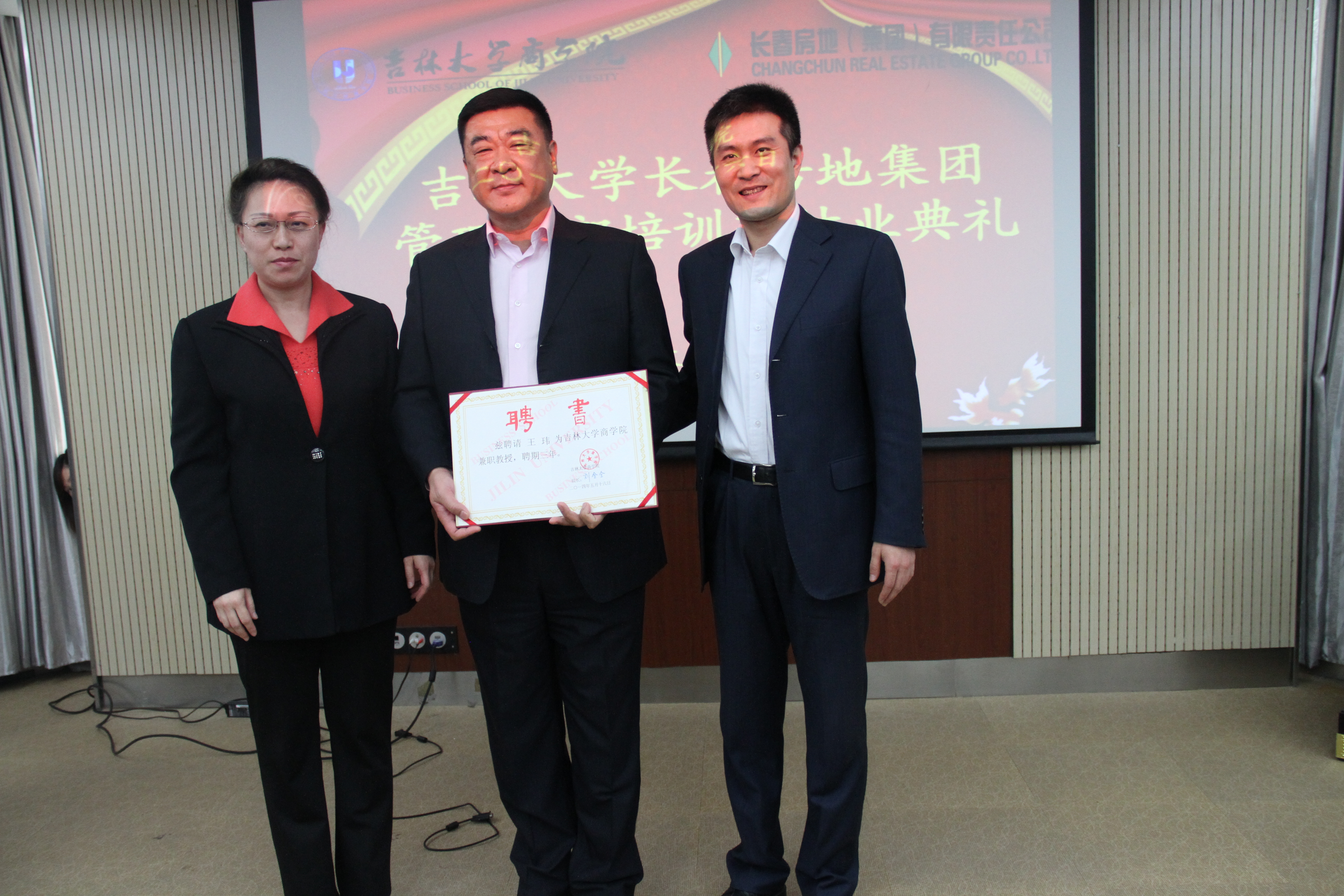 amjs澳金沙门欢迎您副院长张世伟宣布结业学员名单,并与长春房地集团总经理王玮共同为学员代表颁发结业证书。