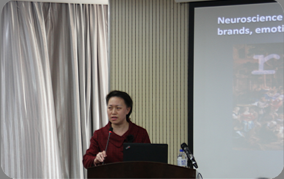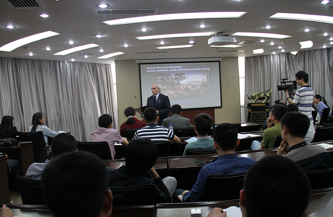 随后,Moutinho 教授开始了题为《Neuroscience and Marketing:brands,emotions,social relevance,and mind reading》的讲座,Moutinho 教授深入浅出地介绍了当今世界市场的新形势,在这样一个全球共享的背景下,企业的营销面临找新的机遇与挑战,如何在新的形势下让企业的品牌得以成长,让消费者对品牌有新的认知,这些问题已经成为了全球企业所共同关注的话题。由此,Moutinho 教授认为神经营销对于发现消费者的认知规律,并采取一系列有价值的营销策略,对企业的品牌成长具有十分重要的价值。Moutinho 教授还用一幅荷兰名画引出话题,向大家介绍了他与他的科研团队在神经科学与营销领域的研究思路和所取得的成果。Moutinho 教授认为传统营销学的问题是往往只关注厂商的利益,而忽视了消费者。而当下的趋势则是更加强调消费者对品牌的认知、品牌对消费者的影响。接着,教授从神经科学的角度分析了消费者神经网络对品牌的认知,通过品牌传达人类的情感,并详细介绍了基础的理论研究模型。从他研究的出发点认为品牌应趋向于人格化,与人类的情感合。Moutinho 教授风趣的语言风格,深厚的学术底蕴给与会师生留下了深刻的印象。