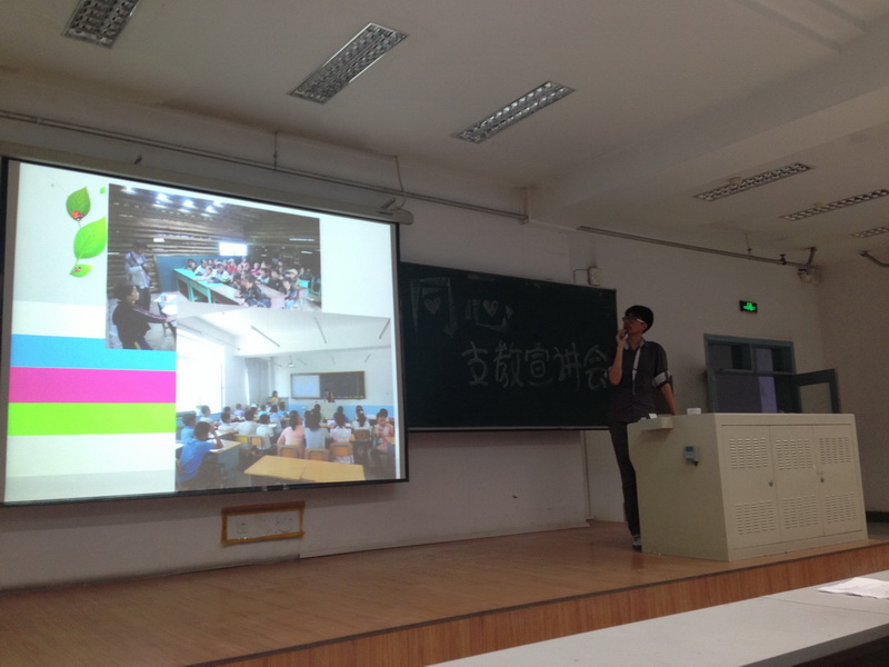 宣讲会定于晚上六点举行,总共分为三个环节来进行。首先是同心志愿者的成员到场进行会场布置;接着宣讲会正式开始,由往年进行过支教的同学讲述其支教经历及其收获;最后由工作人员安排有意向同学填写报名表。