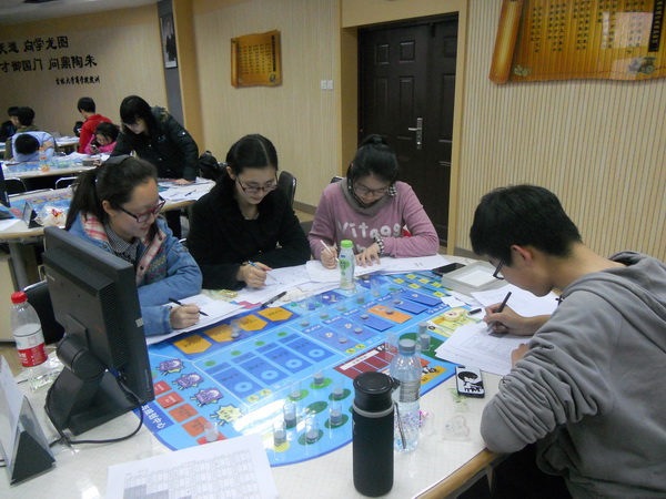 上午八点整,比赛正式开始。企业运营以六年为限,参赛同学分为八个小组,一个小组中的成员分别担任CEO、财务总监、生产总监、采购总监、生产总监和间谍等职位。各组成员都需要尽心尽力地去经营规划好各自的企业,同时绞尽脑汁与其他企业竞争。经过之前的培训,同学们对整个运作流程都熟悉了很多。在开始经营的两年要着重开拓市场,取得ISO认证;在下原材料订单时要计算好资金流动的速度,避免大量囤货,浪费现金。在申请贷款,研发投资,生产商品等一系列环节中,最重要的就是订购商品、竞争广告订单。所谓“知己知彼,百战不殆”,小组成员在订购商品之前需要派出“间谍”来了解对手们的生产状况,以此来制定战略,规划出自己的企业未来发展方向。