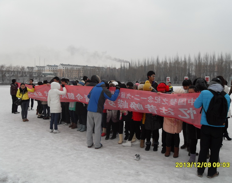 随后,由13级学生代表王柘君发言,王柘君同学的发言像一把烈火点燃了伫立在寒风中的同学们的爱国热情。就像她说的那样,68年前的今天,一群像我们一样拥有满腔爱国热血和理想的青年,为了中华民族的兴亡奋起游行,掀起了全国抗日救国运动的新高潮。68年后的我们,更应该明白自己肩负的重大使命,弘扬一二•九爱国主义精神,体现当代大学生精神风貌。