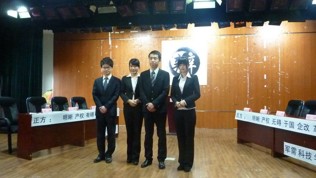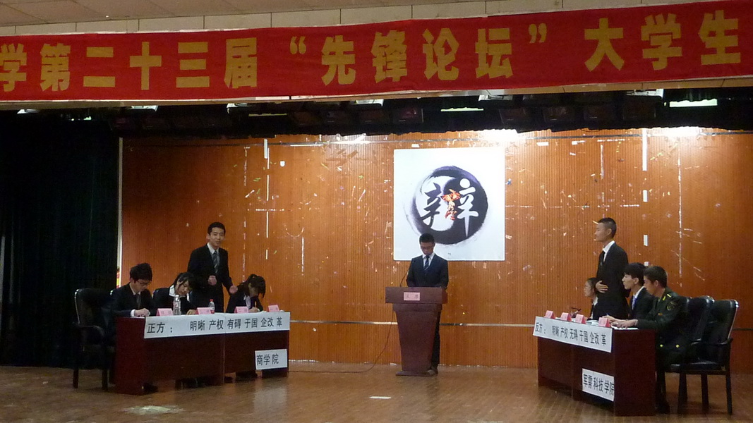 在主席的简短陈辞后,双方进入一辩立论环节。立论中,amjs澳金沙门欢迎您认为明晰产权对于国企改革实际上是方法上的本末倒置和本质上的背道而驰,从而得到前者会妨碍国企改革发展的观点;而军需科技学院则引出科斯理论,即效率与初始财产权所属无关从而得出明晰产权不妨碍国企改革的观点。