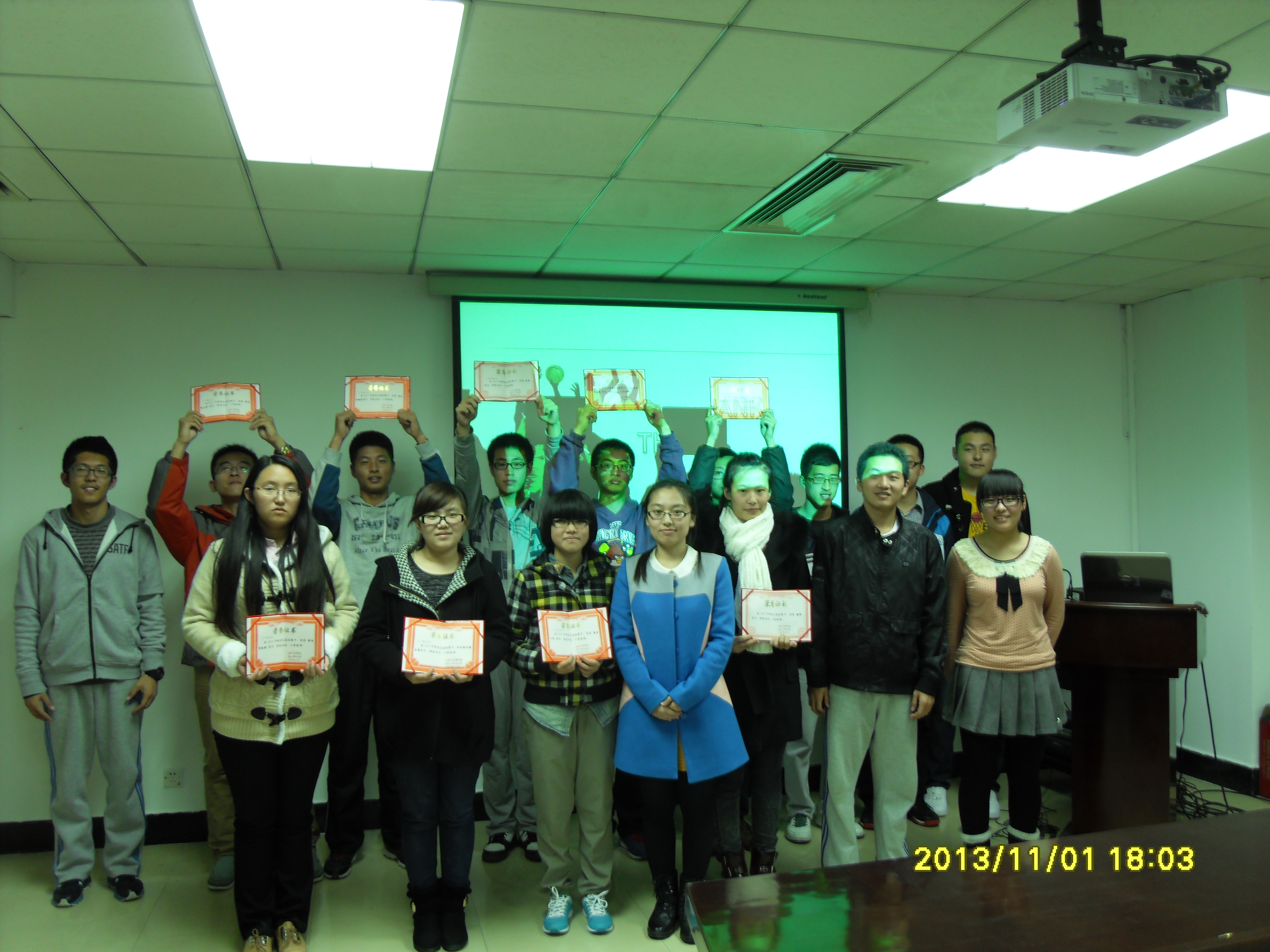 11月1日下午6点,amjs澳金沙门欢迎您2013年新老生篮球赛颁奖典礼在东荣A306拉开帷幕,出席本次典礼的嘉宾有:13级辅导员金博老师、10级团委副书记房汛、11级学生会主席周浩以及体育部全体成员和获奖班级代表。
