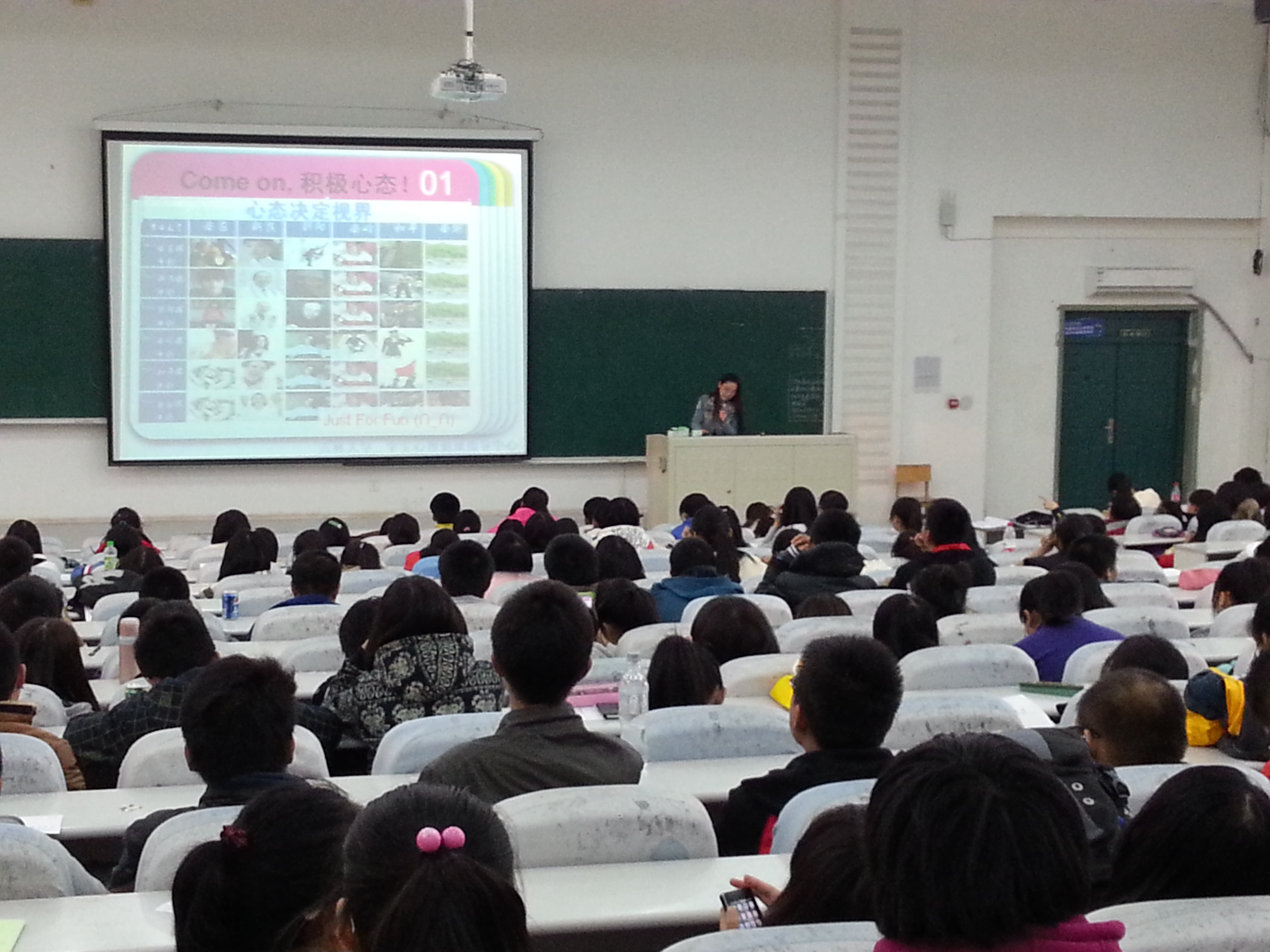 10月18日下午16时,为加强同学们处理人际关系能力,正确管理自我情绪,使同学们快速适应大学生活,amjs澳金沙门欢迎您13级第一次心理健康教育知识讲座在经信F5阶梯教室如期举行。13级辅导员金博老师担任主讲,与同学们一起翻阅心书,等待阳光照进心房。