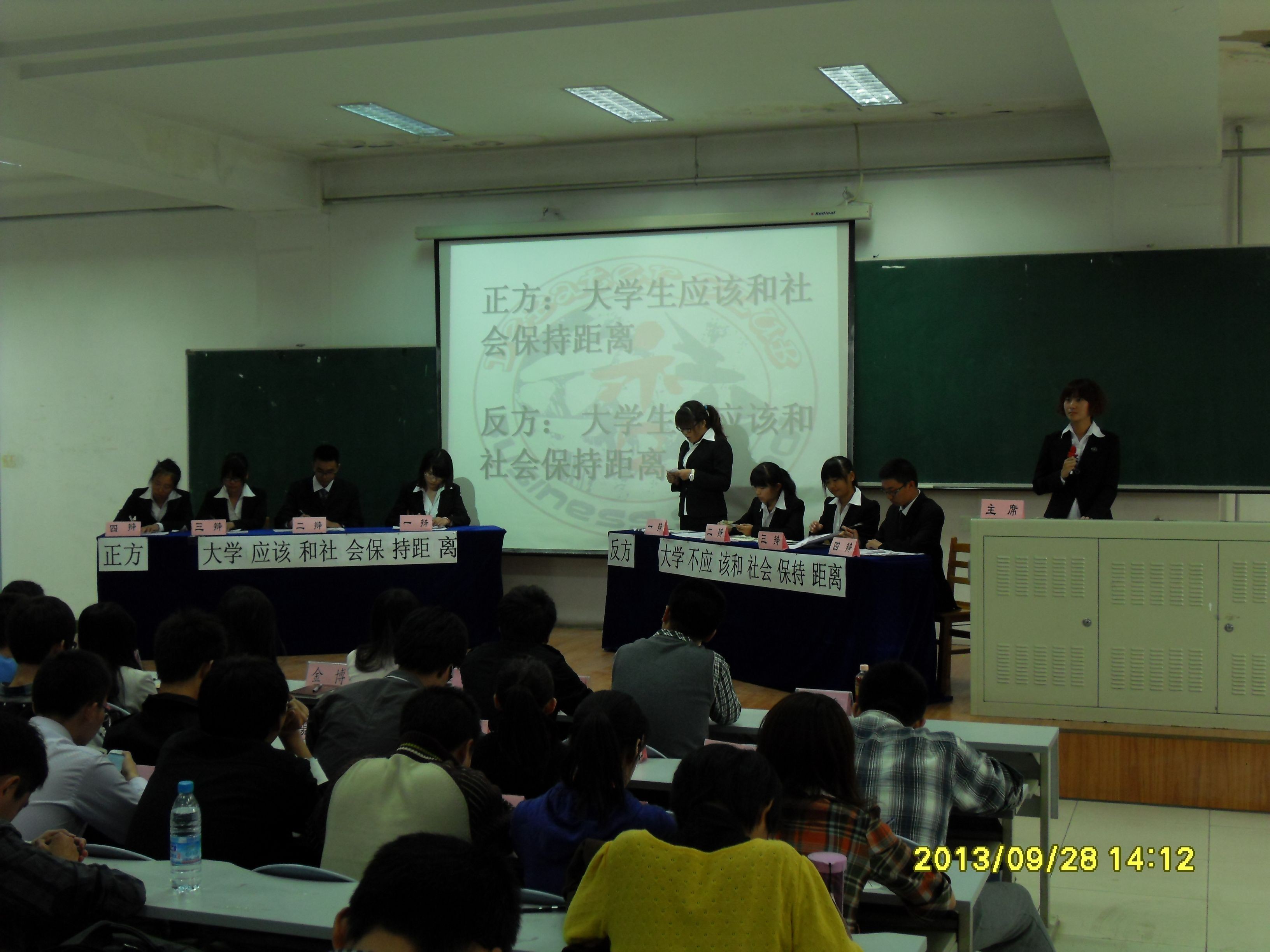 9月28日下午2点,激动人心的amjs澳金沙门欢迎您2013级新生辩论赛决赛在三教九阶举行。正方会计5班,观点为大学应该和社会保持距离;反方为人力7班,观点为大学不应该和社会保持距离。双方围绕各自论点展开了激烈的角逐。