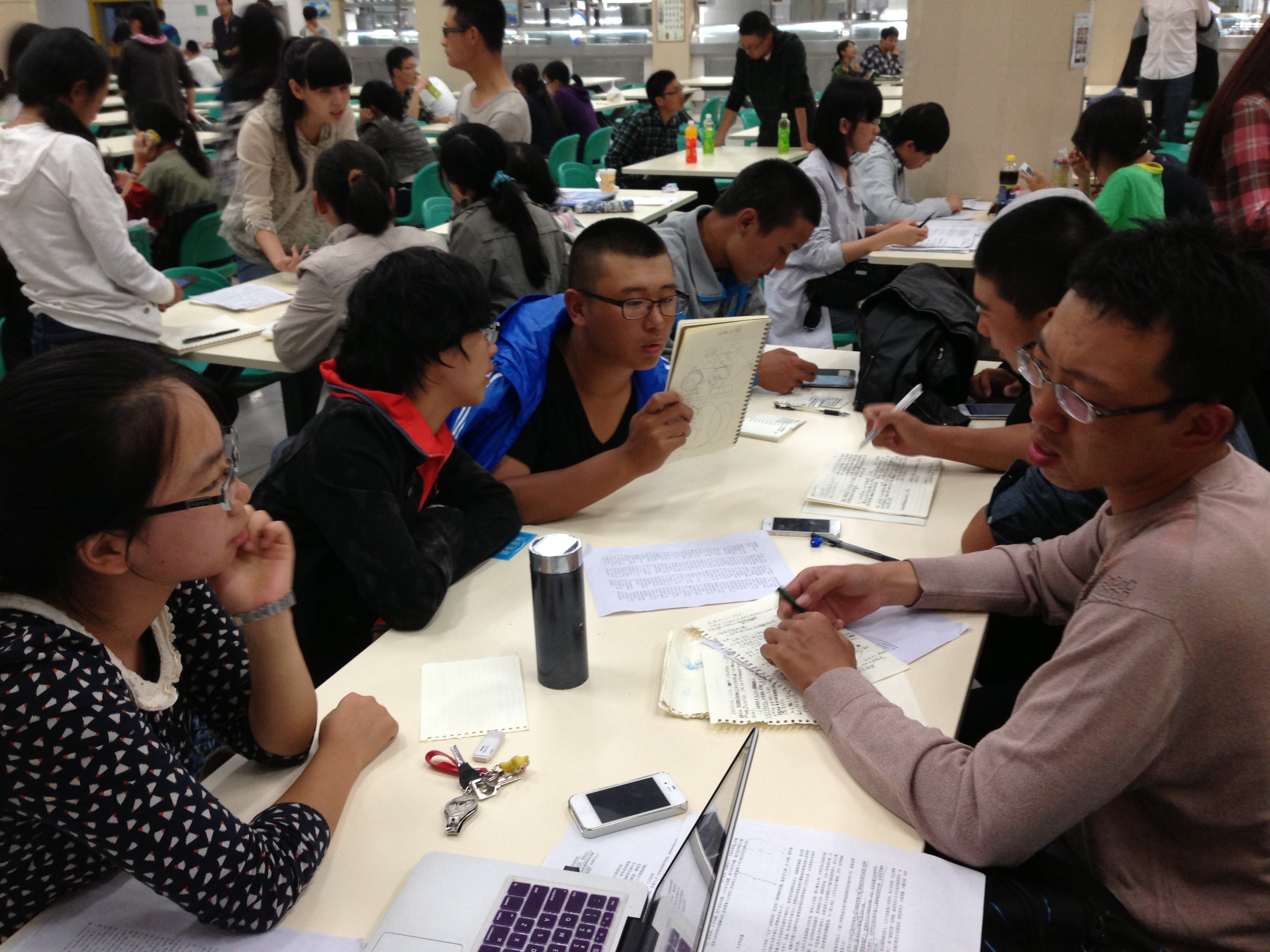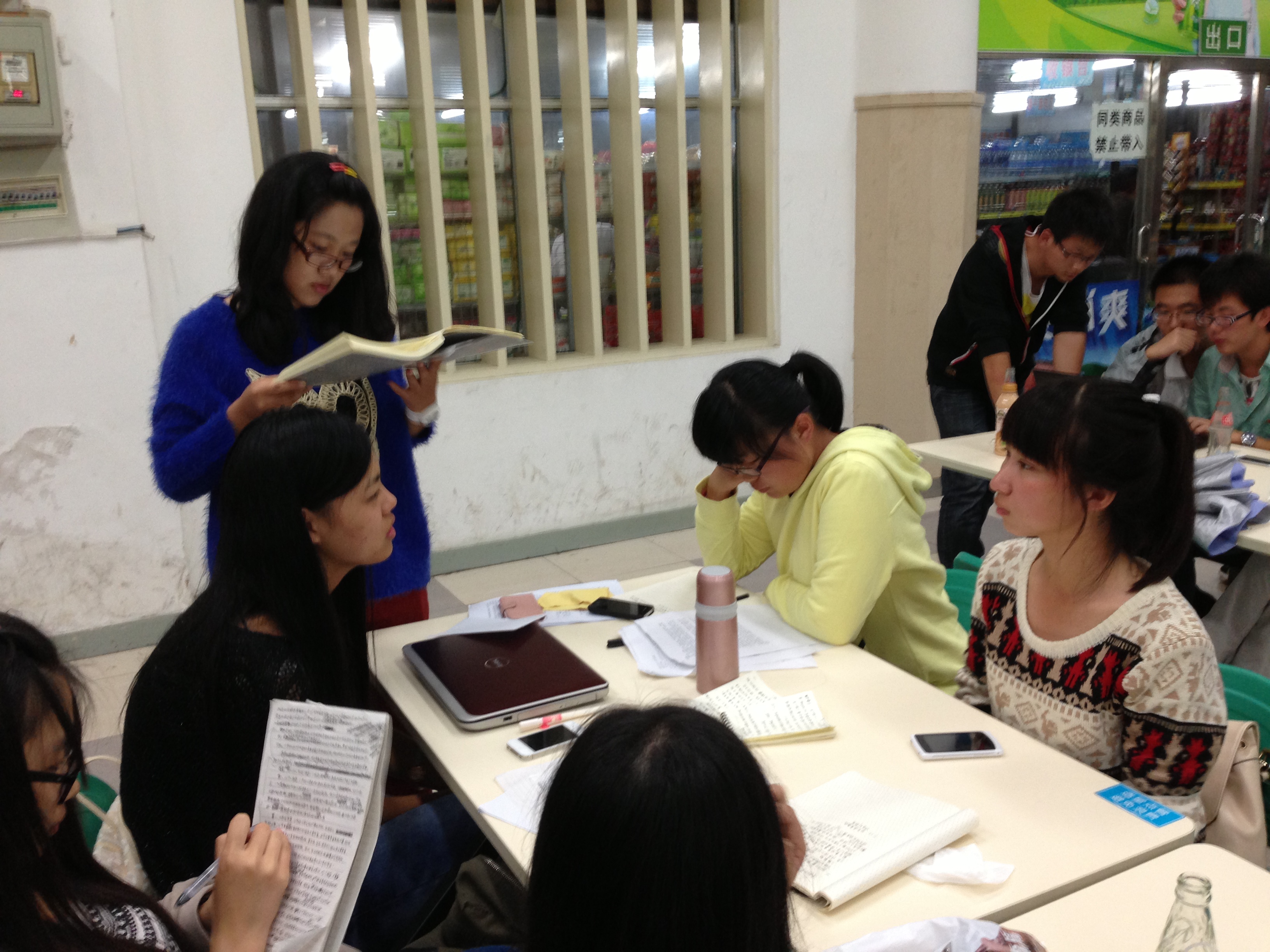 自9月1日到9月7日,2013级参与辩论的同学们将自己的休息时间几近全部地用在了准备即将到来的辩论比赛上。从军训结束晚上8点半一直到深夜的11点,他们或集体讨论、总结资料、交换观点,或独自浏览网页、翻看报纸杂志,为自己的辩题寻找依据。夜晚的莘子园,吃饭的人群早已离开,只留下这样一群为在辩论场上展现自己,实现梦想,超越自我的战士们。每个小组的成员围坐在一个个饭桌旁,他们有人奋笔疾书,有人上网查资料,有人绞尽脑汁思虑对方的提问,有人反复琢磨己方的观点。桌面上罗列着一叠厚厚的纸张,上面布满了他们讨论后的文字,密密麻麻,犹如铭文般刻下了他们进入大学后寻梦的痕迹。