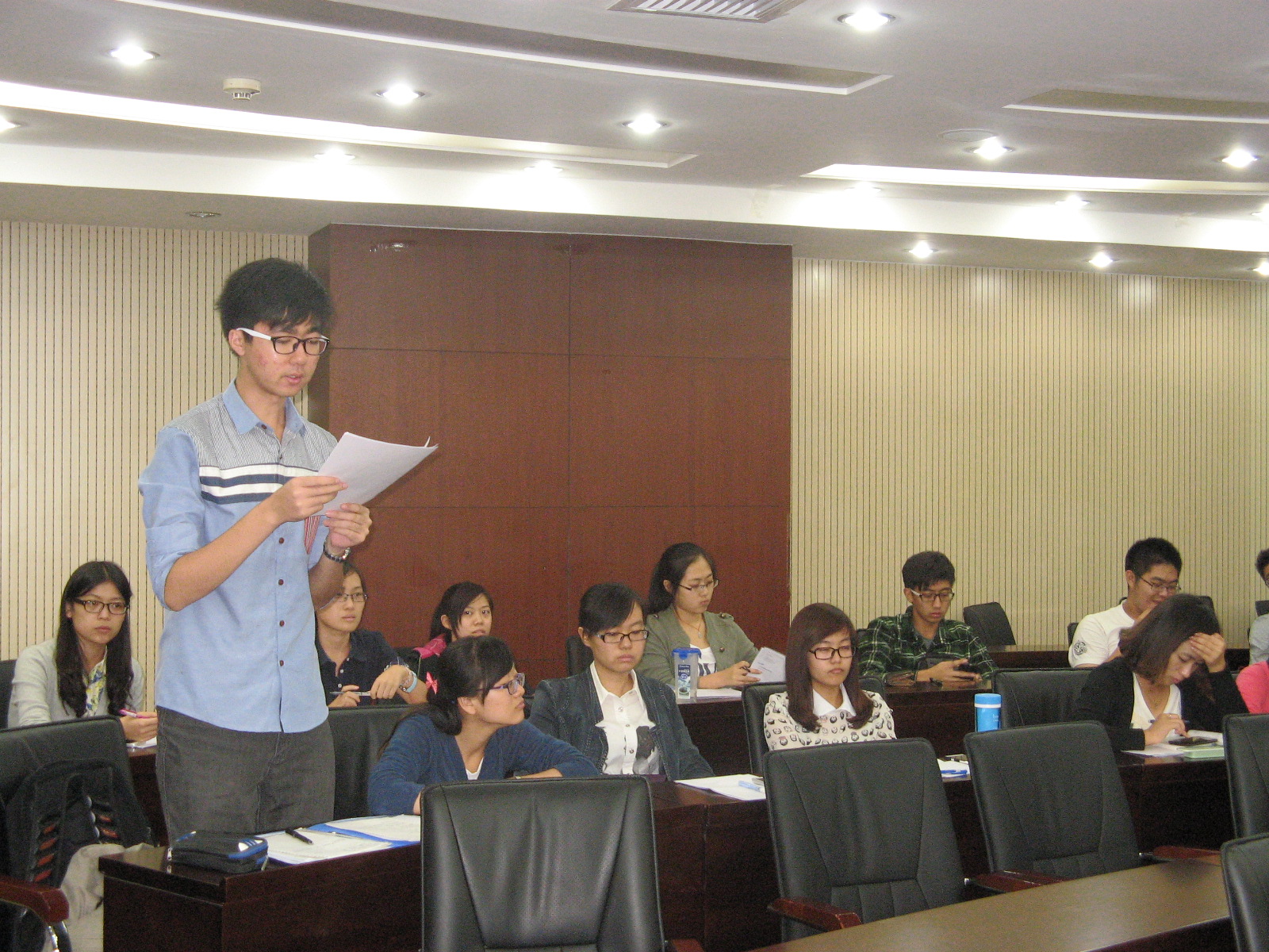 金博老师在每位党员讲述完自己的学习心得后,肯定了大家这段时期的学习成果,并且希望大家将这种状态加以保持,同时建议大家每人都准备一个学习笔记,定期记录自己的学习感悟。金博老师还指出,学生党员应首先在学习上起模范作用,帮助学习上有困难的同学,并就此想法与在座的学生党员深刻地交流了意见。其次,她还指出作为学生党员,要落实党的群众路线还应真正地为社会公益服务,并创新地提出了与福利院联系,让学生党员起带头作用,去把关怀与温暖带给那些需要帮助的孩子们。