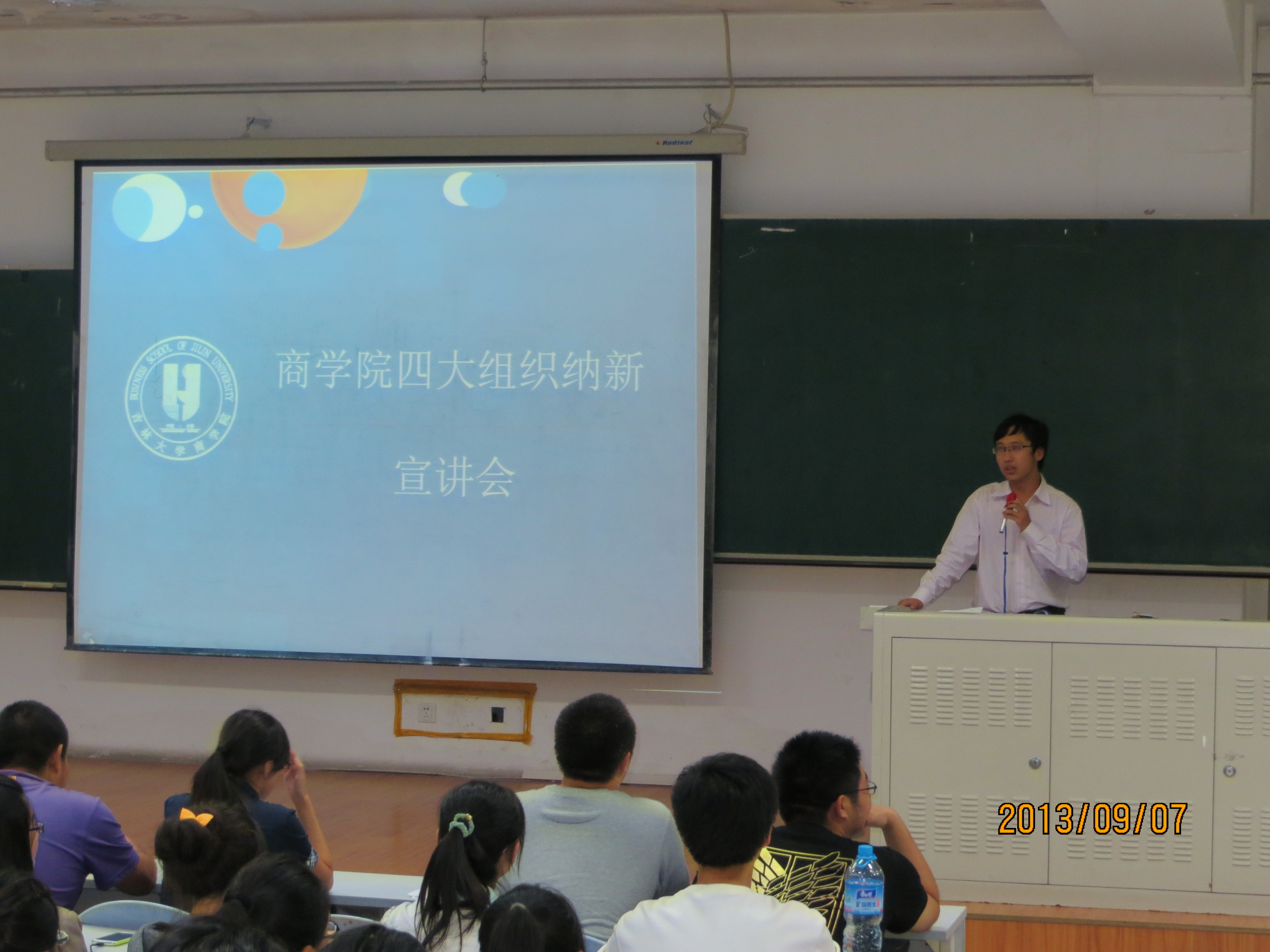 9月7日晚八点三十分,amjs澳金沙门欢迎您社团组织及各协会纳新宣讲活动在三教九阶火热召开。参加此次活动的有12级辅导员荣诗达老师、13级辅导员金博老师、前任学生会主席张骞予、11级12级四大组织和协会成员以及13级amjs澳金沙门欢迎您所有新生。amjs澳金沙门欢迎您四大组织由团委、学生会、社团联合会和记者站组成,是一个积极向上,纪律严明,分工明确的集体,其中各组织内部又有更加细致的部门分工。amjs澳金沙门欢迎您已经逐渐发展成一个创新型且极具发展潜力的学院,旗下的社团各具特色,极具吸引力。这些社团包括同心志愿者协会、企业模拟竞技协会、展翼学社、91job求职联盟、成功学协会、管理学研究小组,以及今年刚刚成立的未来职场精英联盟。