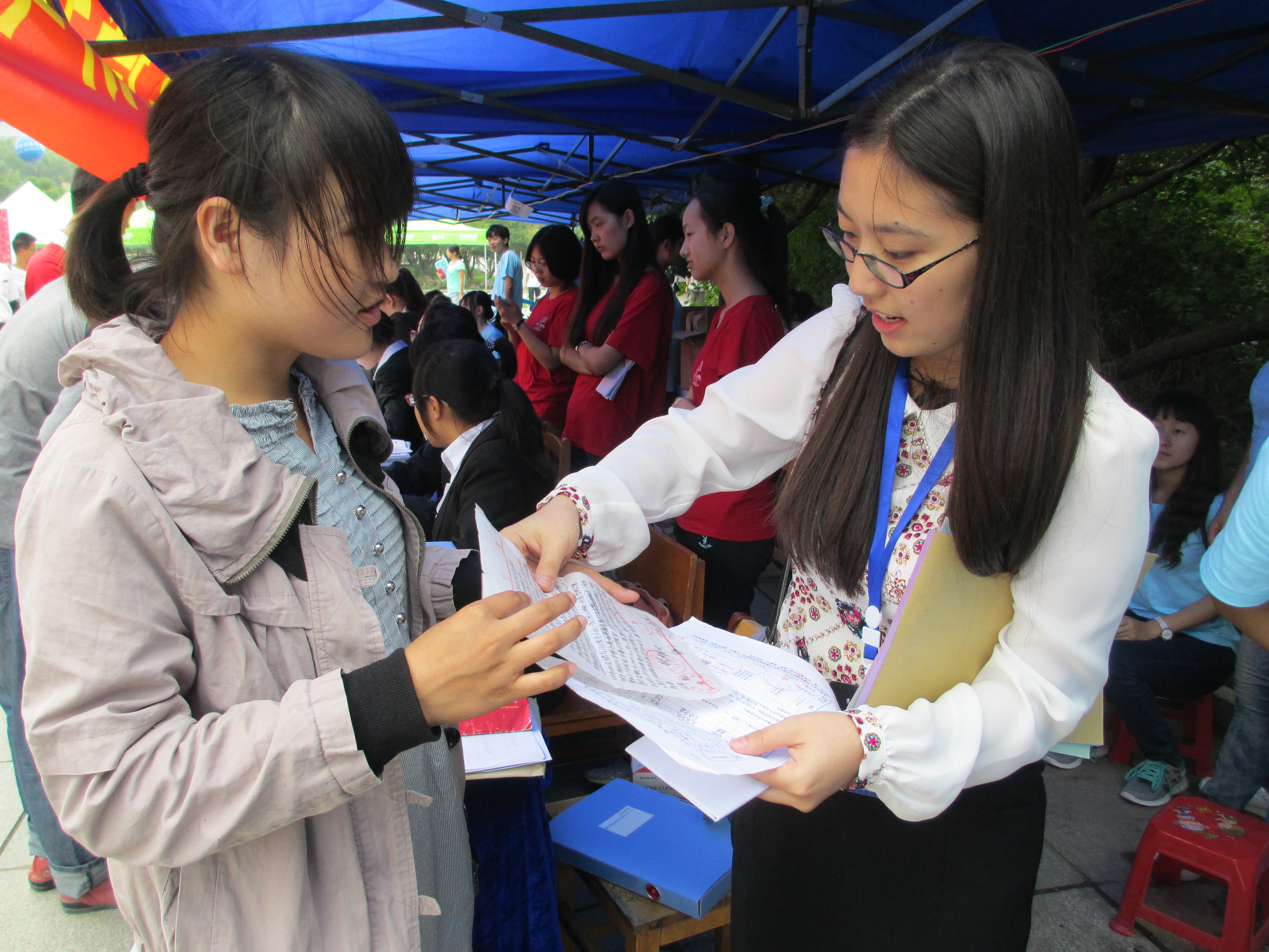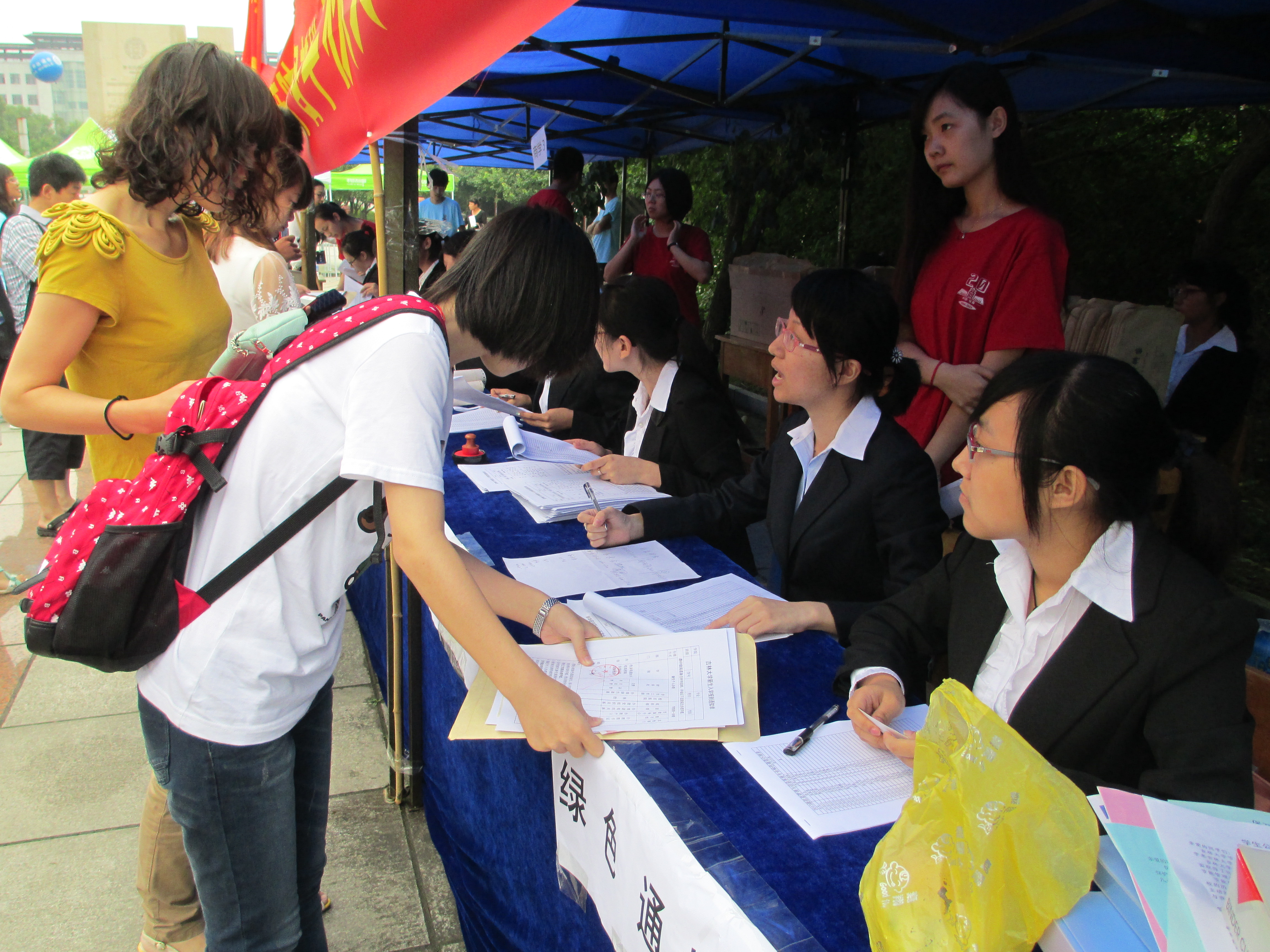 工作人员与志愿者们刚到就马上投入到了迎新工作中,有的帮新生登记,发放材料,有的引导新生到寝室,有的主动为他们拎行李。每个人都将繁杂的工作进行得有条不紊。