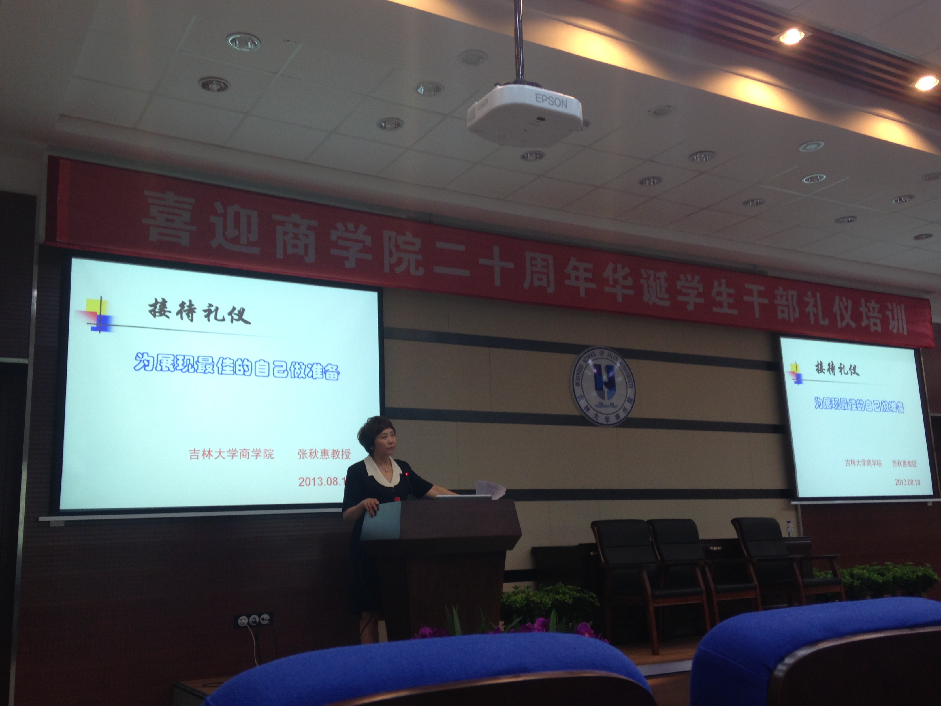 8月10日上午九点,东荣B310的礼仪培训正如火如荼地进行着。本次培训特邀amjs澳金沙门欢迎您人力资源管理系张秋惠教授担任主讲老师,参加此次培训的有12级辅导员荣诗达老师,以及amjs澳金沙门欢迎您全体学生干部。张老师以独特的个人魅力和幽默诙谐的语言博得了同学们的阵阵掌声。