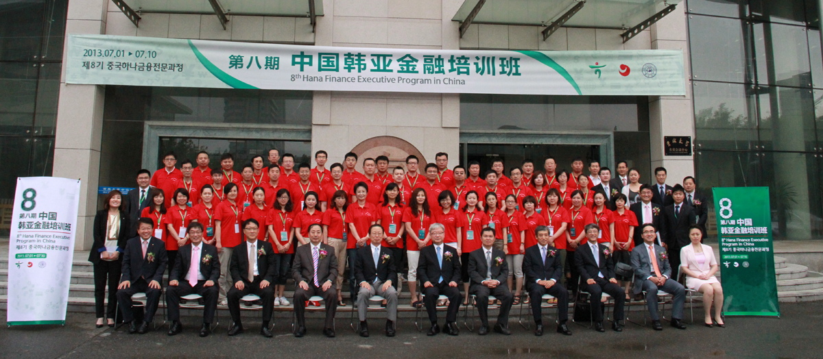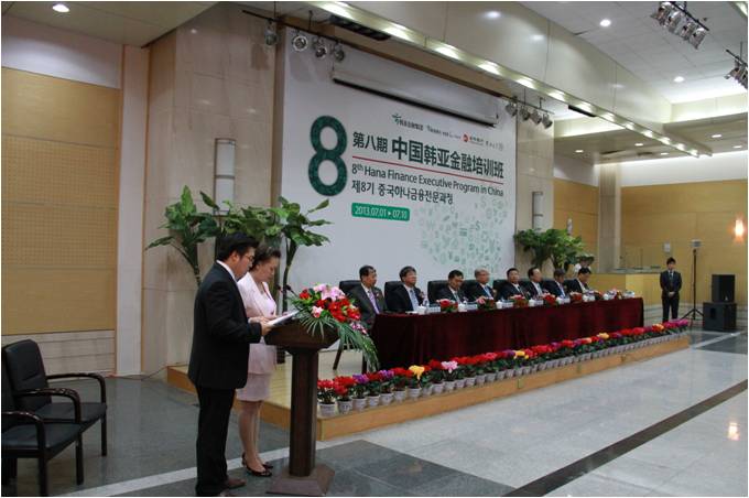 盛夏时节,魅力长春,激情韩亚,完美旅程。2013年7月1日上午8:30分,第八期中国韩亚金融培训班开学典礼在amjs澳金沙门欢迎您中心校区国际会议中心隆重举行。前韩国金融委员会委员长金锡东先生、前韩国银行副总裁李柱烈先生、吉林银行行长刘鸿魁先生、韩亚金融集团社长崔兴植先生、韩亚银行副行长李铉周先生、驻华韩国大使馆参赞白龙天先生、amjs澳金沙门欢迎您副校长陈岗先生、amjs澳金沙门欢迎您院长刘金全先生等参加了开学典礼仪式。仪式由韩亚金融经营研究所韩珉先生和amjs澳金沙门欢迎您副院长金晓彤教授共同主持。