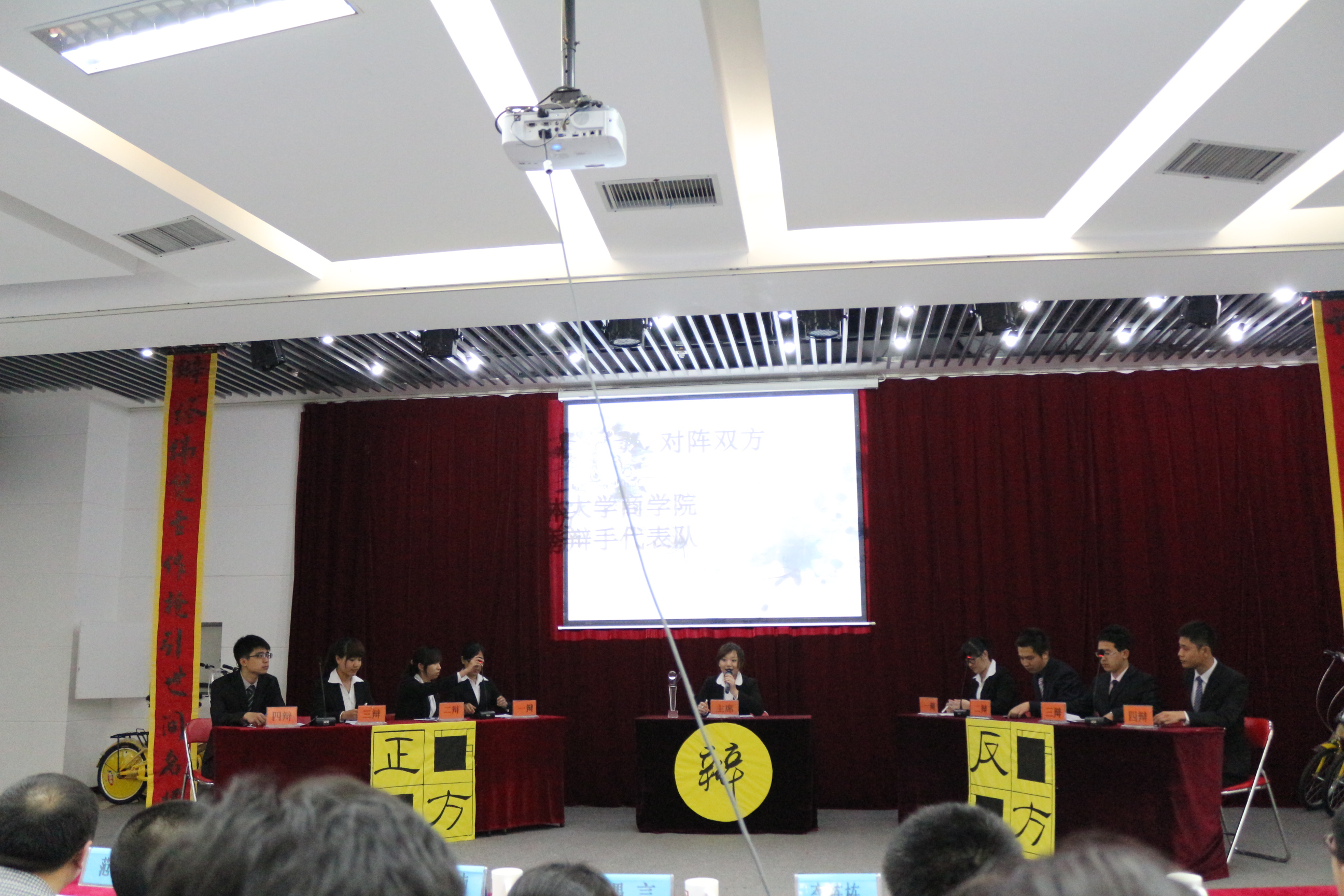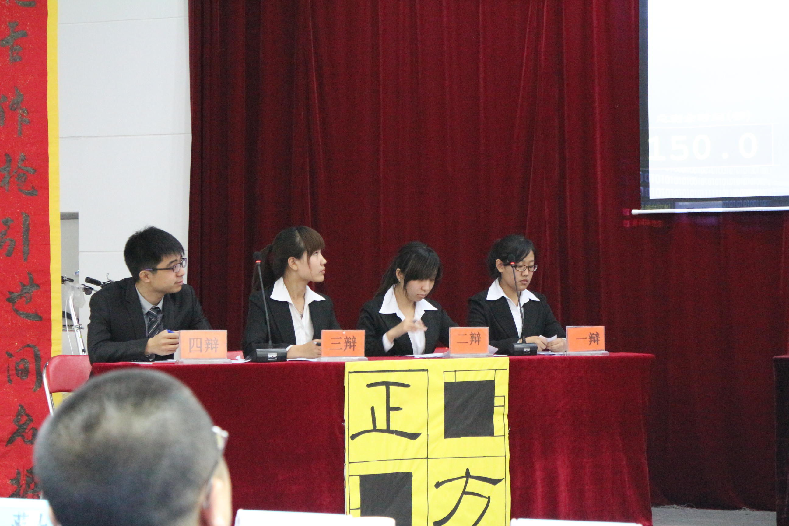 整场辩论赛气氛和谐融洽,双方辩手都非常友好礼貌地提问和解答。立论环节,正方辩手们凭借精辟的措辞,犀利的言辞,展现出咄咄逼人的气势。在随后的盘问,小结,驳辩,攻辩环节中,双方更是针锋相对、步步紧逼,现场气氛迅速升温,达到白热化阶段,正方三辩灵活的思维和反方四辩的幽默给观众留下了深刻的印象。大赛进行到短兵相接的自由辩论环节,赛场气氛紧张激烈,双方辩手针锋相对,唇枪舌剑,你来我往,却又不失风度,侃侃而谈。在最后的总结陈词环节,双方四辩针对对手逻辑上的漏洞逐一回击,思路清晰,引经据典。八位辩手良好的风范、出色的口才、敏捷的思维令场下观众为之折服。