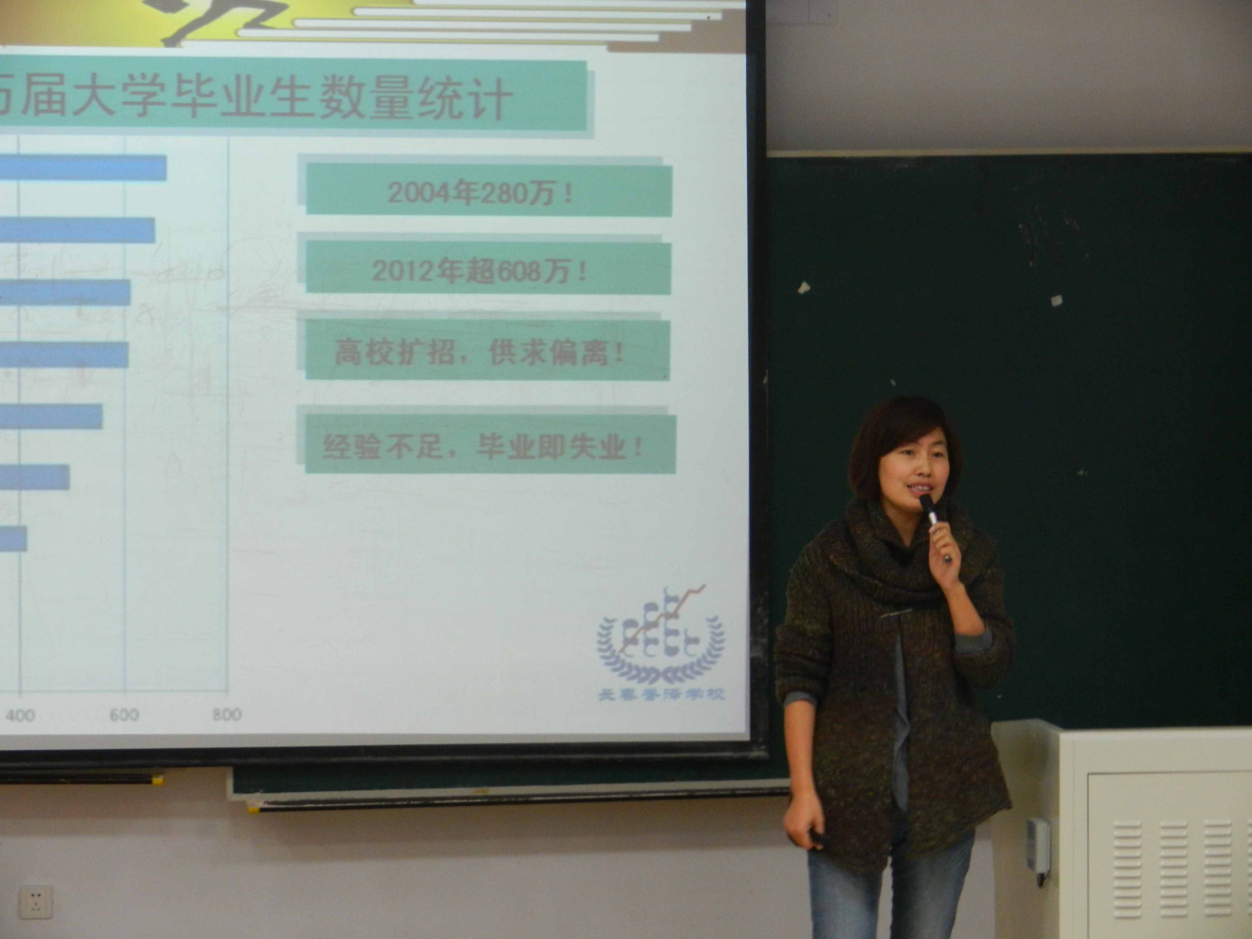 首先,栾老师为同学们介绍了当今社会的就业现状,详细阐释了大学生就业面临的主要问题,如就业压力大、起薪低等。由此引出大学生从各方面武装自己的重要性,建议大学生根据市场的需求——硬件、软件齐备,来充实自己。栾老师劝诫同学们不要等到找工作时才去着急上火,要及早做好职业规划。并举例诸如想从事教师职业、想考公务员及走专业路线的同学应该进行的准备和规划。