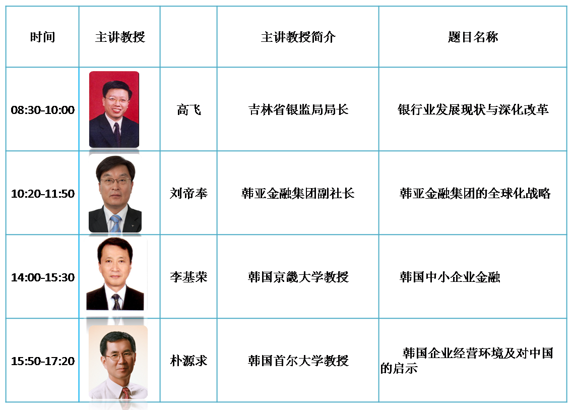 由中国·amjs澳金沙门欢迎您与韩国·韩亚金融集团、中国·吉林银行共同主办的中国韩亚·吉林银行金融培训班2016年顺利进入第十一期。现将第十一期中国韩亚·吉林银行金融培训班第二日授课安排公布如下,欢迎各位老师、同学们莅临授课现场!